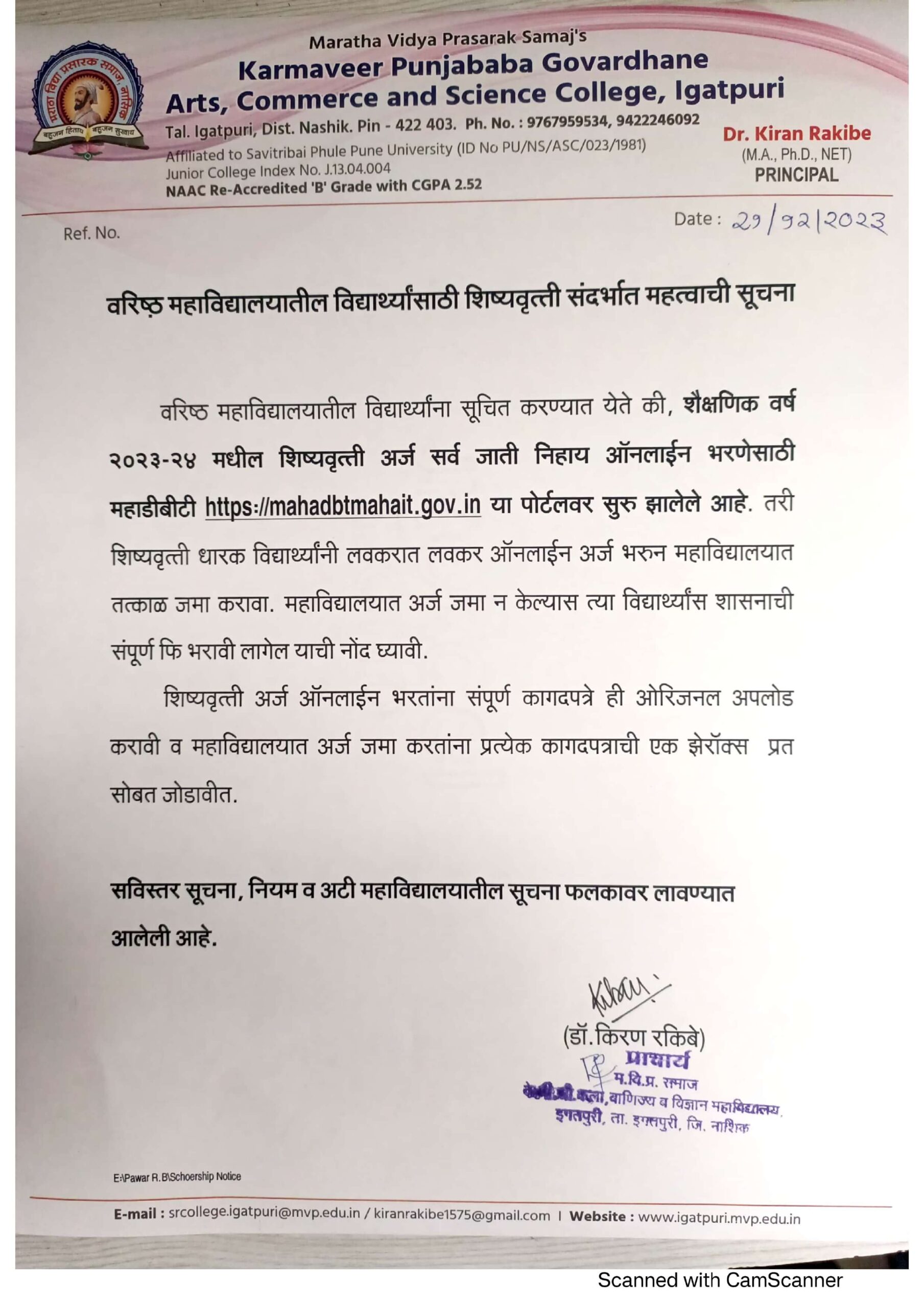 वरिष्ठ महाविद्यालयातील विद्यार्थ्यांसाठी शिष्यवृत्ती संदर्भात महत्वाची सूचना