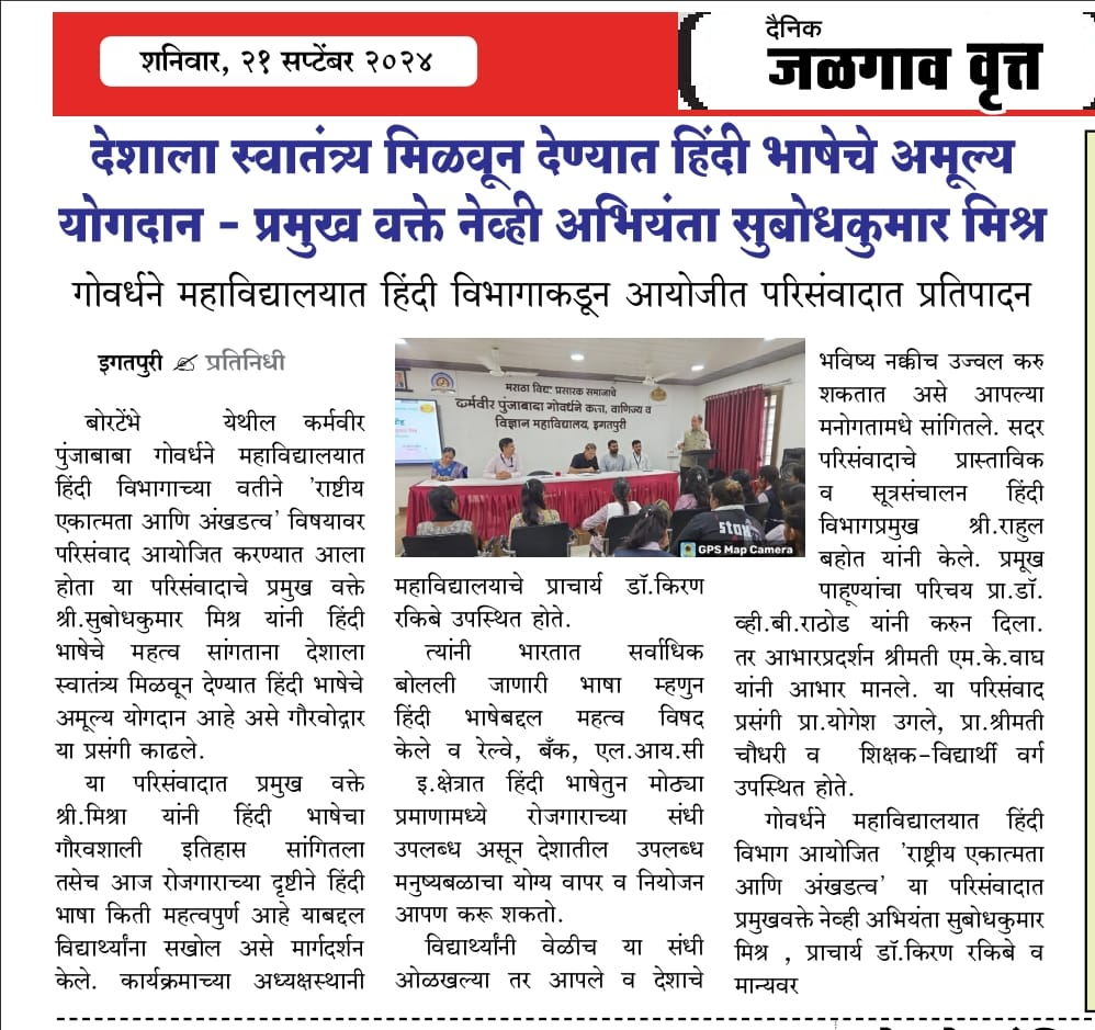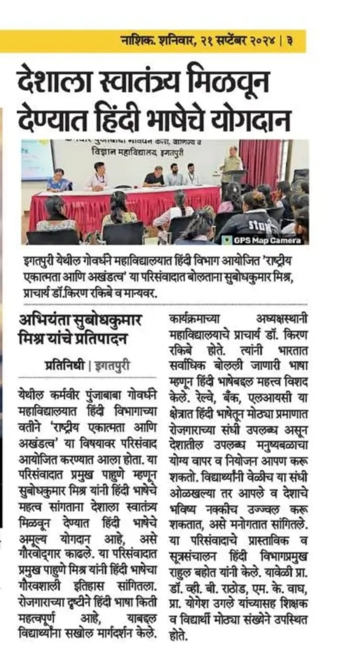 Best Practice- 14th Sept.2024 Hindi day Celebration Chief Guest Mr.Subodhkumar Mishra delivered the lecture –‘Hindi Bhasha me rojgaar ke avsar”