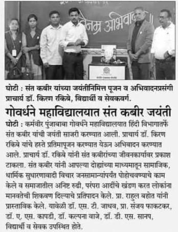| 22 June 2024 To Celebrate Sant Kabeerdas jayanti Programme speech for Dr.Kiran Rakibe,Mr.Rahul Bahot and all Teaching Staff | 22 June 2024 To Celebrate Sant Kabeerdas jayanti Programme speech for Dr.Kiran Rakibe,Mr.Rahul Bahot and all Teaching Staff | |||
