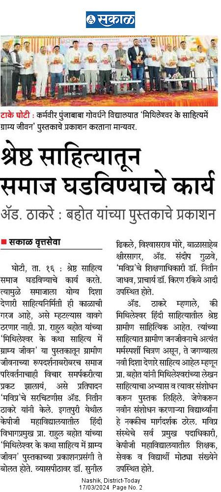 | 1. | प्रा.राहुल बहोत | “मिथिलेश्वर के कथा साहित्य में ग्राम्य जीवन “ | 14 मार्च 2024 | के.पी.जी.कला,वाणिज्य एवं विज्ञानं महाविद्यालय,इगतपुरी. | चिंतन प्रकाशन,कानपुर. (ऊ.प्र.) | 978-81-967289-7-7 |