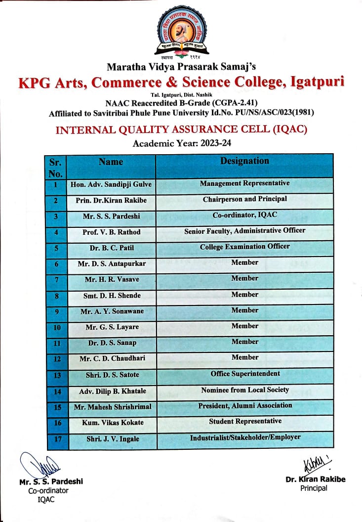The IQAC cell is functional in M.V.P. Samaj’s K.P.G. Arts, Commerce and Science College, Igatpuri since Jan 2019. It started under the Co-ordinator S. S. Pardeshi . IQAC office has a full-fledged office with the state of art facilities in the College building.