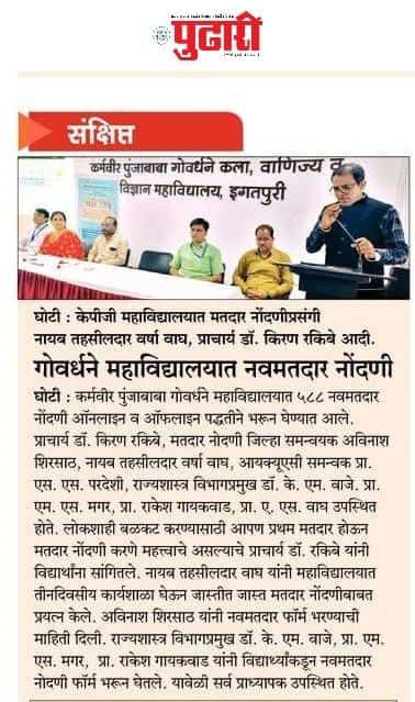 Maratha Vidya Prasarak Samaj’s Karmaveer Punjababa GoverdhaneArts, Commerce and Science CollegeIgatpuri, Nashik-422403, Maharashtra, INDIA. Affiliated to Savitribai Phule Pune University (ID. No. PU/NS/ASC/023/1981) | Junior College Index No. J.13.04.004 NAAC Re-Aceredited (“B” Grade with CGPA 2.52)  |