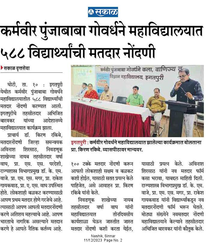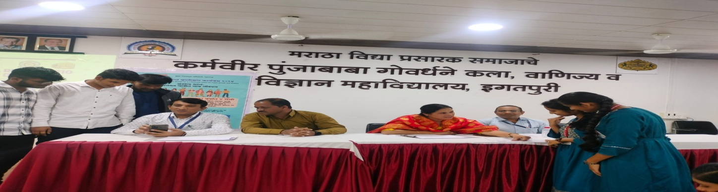 Maratha Vidya Prasarak Samaj’s Karmaveer Punjababa GoverdhaneArts, Commerce and Science CollegeIgatpuri, Nashik-422403, Maharashtra, INDIA. Affiliated to Savitribai Phule Pune University (ID. No. PU/NS/ASC/023/1981) | Junior College Index No. J.13.04.004 NAAC Re-Aceredited (“B” Grade with CGPA 2.52)  |